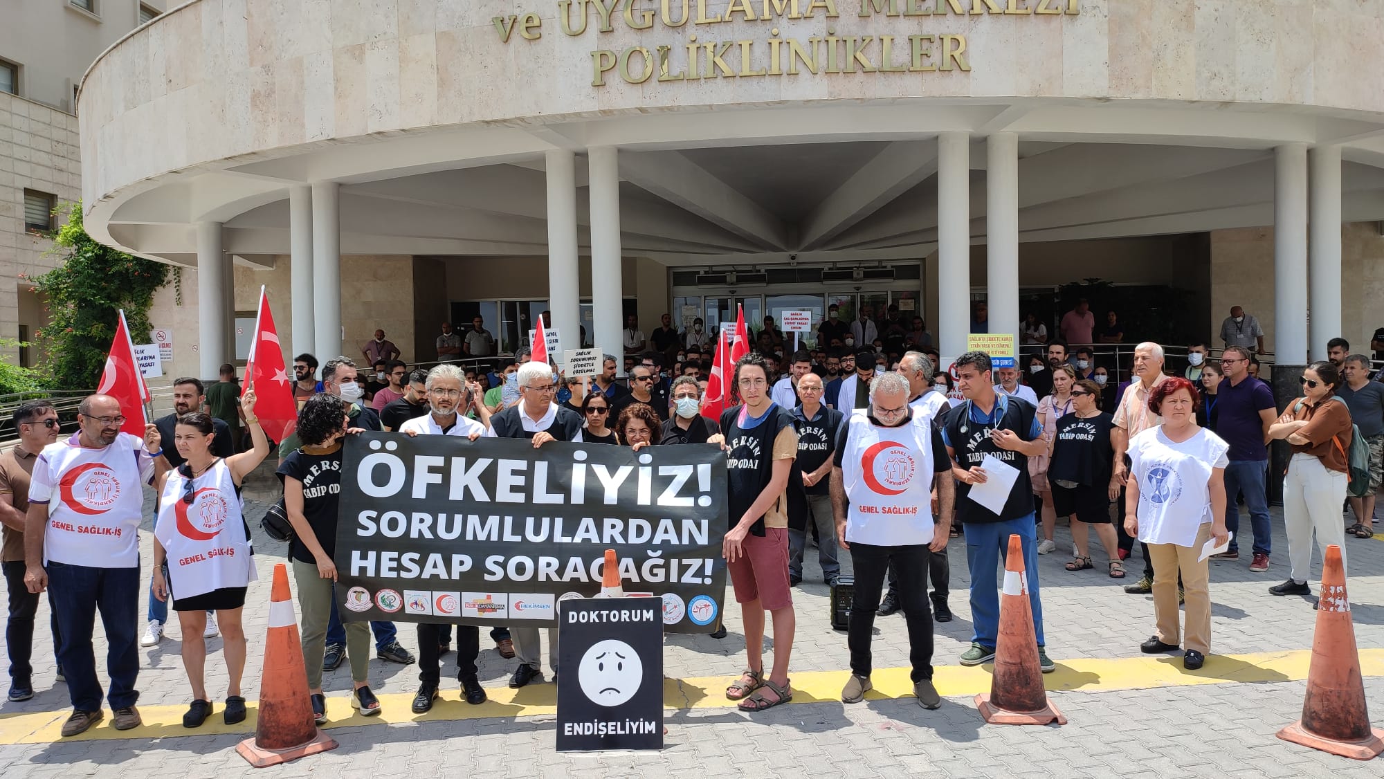 Mersin Tabip Odası, SES, Türk Sağlık Sen öncülüğünde Mersin Üniversitesi Tıp Fakültesi Hastanesi önünde bir araya gelen sağlık emekçileri, burada basın açıklaması gerçekleştirdi. ”Öfkeliyiz, sorumlulardan hesap soracağız” yazılı pankartın açıldığı açıklamada “Sağlıkta şiddet sona ersin” Güvenli çalışma alanları istiyoruz” Emeğe saygı şiddete sıfır tolerans”, “Sağlık sorununuz şiddetle çözülemez” dövizleri taşındı.