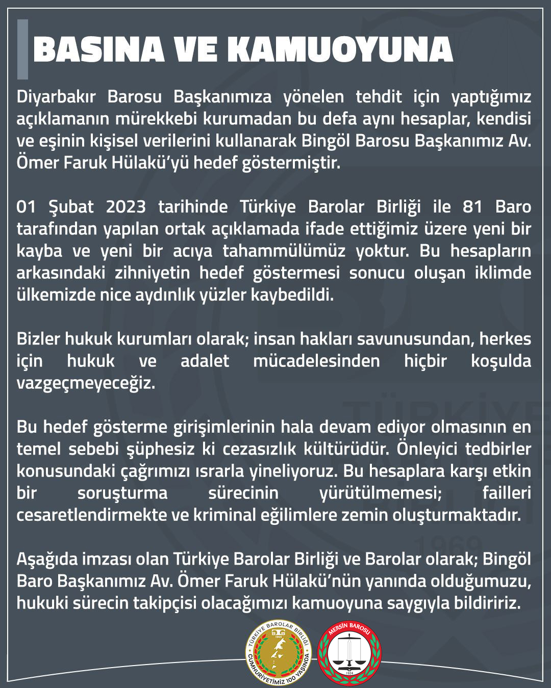 TBB ve baroların ortak açıklamasında, “Diyarbakır Barosu Başkanımıza yönelen tehdit için yaptığımız açıklamanın mürekkebi kurumadan bu defa aynı hesaplar, kendisi ve eşinin kişisel verilerini kullanarak Bingöl Barosu Başkanımız Av. Ömer Faruk Hülakü’yü hedef göstermiştir. 01 Şubat 2023 tarihinde Türkiye Barolar Birliği ile 81 Baro tarafından yapılan ortak açıklamada ifade ettiğimiz üzere yeni bir kayba ve yeni bir acıya tahammülümüz yoktur. Bu hesapların arkasındaki zihniyetin hedef göstermesi sonucu oluşan iklimde ülkemizde nice aydınlık yüzler kaybedildi” ifadeleri kullanıldı.