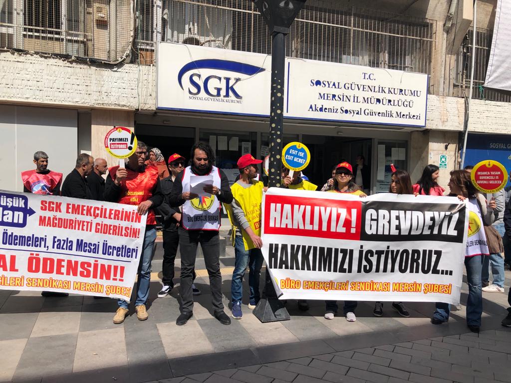Emeklikte Yaşa Takılanlara emeklilik hakkının tanınmasıyla iş yükleri artan Sosyal Güvenlik Kurumu (SGK) çalışanlarının yeniden gündeme gelmesi nedeniyle bu alanda örgütlenen BES tarafından özlük haklarının iyileştirilmesi istemiyle eylem kararı aldı. Türkiye genelinde, her perşembe günü şube ve temsilciliklerinin bulunduğu illerde SGK önünde açıklama yapma kararı alan BES Genel Merkez Yönetimi’nin kararı doğrultusunda Mersin Şubesi, SGK Mersin İl Müdürlüğü önünde açıklama gerçekleştirdi.