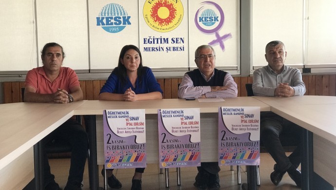 Eğitim ve Bilim Emekçileri Sendikası (Eğitim Sen) Mersin Şubesi, Eğitim İş, Hürriyetçi Eğitim Sen TEÇ-SEN, Anadolu Eğitim Sen, Özgür Eğitim Sen, Eğitim Hak-Sen, Eksen Eğitim-Sen, İdeal Eğitim Sen, Eğitim Söz Sen, Eğitimde Birlik Sen, Eşit Haklar Sendikası, Öğretmenlik Meslek Kanunu’nun iptal edilmesi ve 2 Kasım’da yapacakları iş bırakma eylemine ilişkin Eğitim Sen Mersin Şube binasında ortak basın toplantısı düzenledi. Açıklamaya Eğitim Sen Kadın Sekreteri Simge Yardım, İnsan Hakları Derneği (İHD) Mersin Şube Eşbaşkanı Hakkı Demir katıldı.