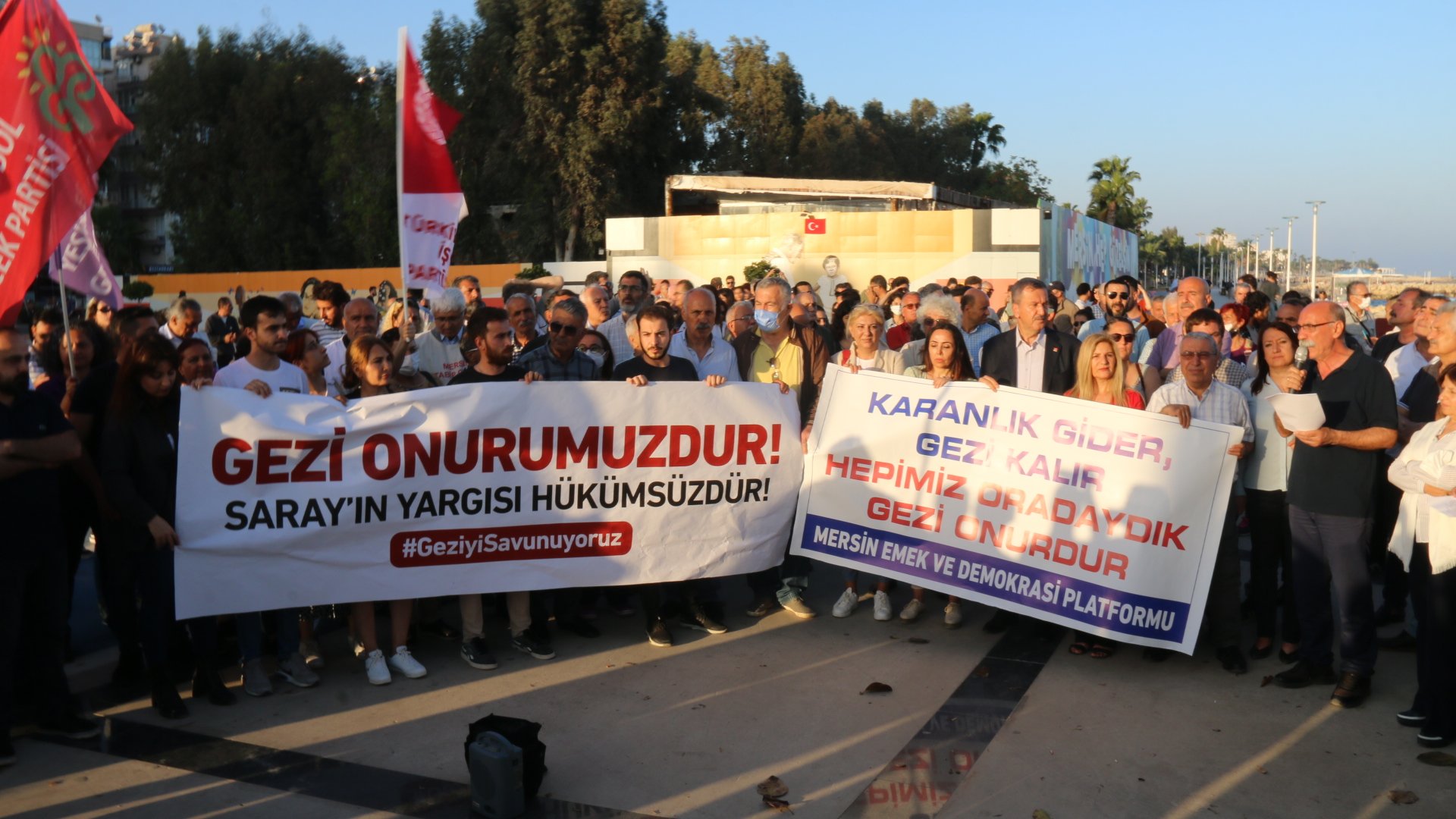 Gezi Parkı eylemlerine ilişkin davada, Osman Kavala’ya ağırlaştırılmış müebbet, Mücella Yapıcı, Çiğdem Mater, Hakan Altınay, Can Atalay, Mine Özerden, Yiğit Ali Ekmekçi, Tayfun Kahraman’a da 18’er yıl hapis cezası verilmesi Mersin’de protesto edildi. Özgecan Aslan Barış Meydanı’nda bir araya gelen Mersin Emek ve Demokrasi Platformu bileşenleri, “Gezi onurumuzdur, sarayın yargısı hükümsüzdür” pankartı ve “Biz geziciyiz siz gidicisiniz” ile “Gezi yargılanamaz” dövizleri açarak, “Gezi şehitleri ölümsüzdür”, “Bu daha başlangıç mücadeleye devam”, “Her yer gezi her direniş” sloganları attı. Açıklamaya Halkların Demokratik Partisi (HDP) Mersin Milletvekilli Fatma Kurtalan ve Mersin Emek ve Demokrasi Platformu bileşenleri katıldı.