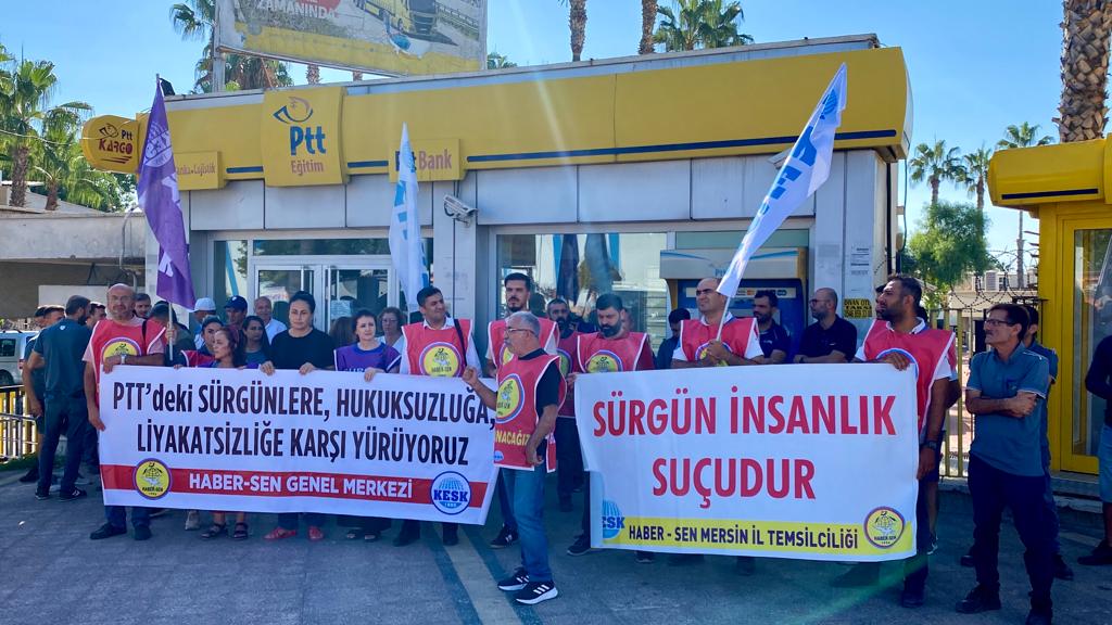 -Haber-Sen Mersin İl Temsilciliği, PTT’deki baskı, mobbing, sendikal ayrımcılık ve sendika üyelerinin sürgün edilmesine karşı eylem yaptı. Yenişehir PTT önünde yapılan eylemde, “Sürgün insanlık suçudur”, “PTT’deki sürgünlere, hukuksuzluğa, liyakatsizliğe karşı yürüyoruz” pankartları açıldı.