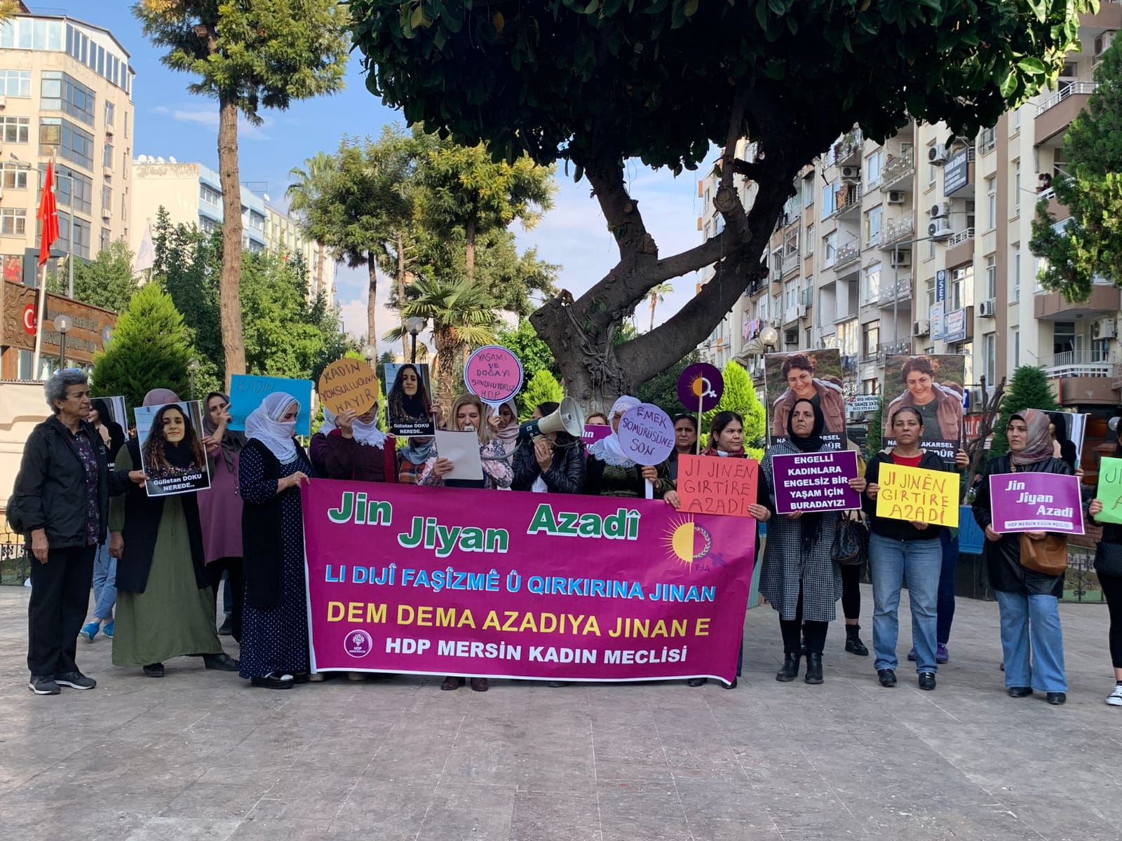 Halkların Demokratik Partisi (HDP) Mersin Kadın Meclisi ve Tevgera Jinen Azad (TJA), 25 Kasım Kadına Yönelik Şiddetle Uluslararası Mücadele Günü dolayısıyla başladıkları etkinliklerinin startını Özgür Çocuk Parkı’nda verdi. “Jin jiyan azadî” pankartının açıldığı eyleme, İHD Mersin Şube Eşbaşkanı Zeynep Benli ve çok sayıda kadın aktivist katıldı. Eylem sırasında kadınlar sık sık “Jin jiyan azadî” ve “Susmuyoruz, korkmuyoruz, itaat etmiyoruz” sloganlarını attı. Açıklama metnini HDP Mersin İl Eşbaşkanı Bedriye Kuş okudu.