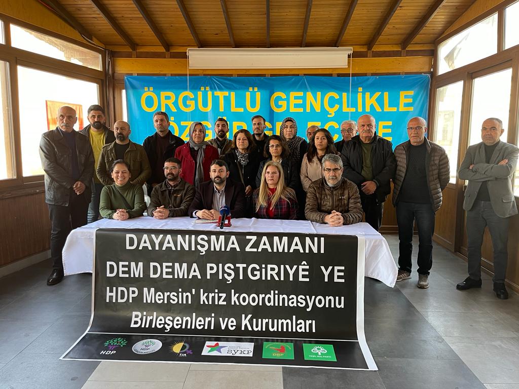 Halkların Demokratik Partisi (HDP) Mersin İl Örgütü, 6 Şubat tarihinde meydana gelen ve 11 ilde yıkıcı etkiye neden olan depremde, yaraları sarmak için kurdukları İl Deprem Kriz Koordinasyon Masası kapsamında yürütülen çalışmalar hakkında basın açıklaması düzenledi. İl binasında düzenlenen açıklamayı, İl Eşbaşkanı Hoşyar Sarıyıldız okudu. Dayanışmanın büyütülmesi çağrısının yinelendiği açıklamada Sarıyıldız, sözlerine depremde yaşamını yitirenlere Allah’tan rahmet ve yaralılara acil şifalar dileyerek başladı.