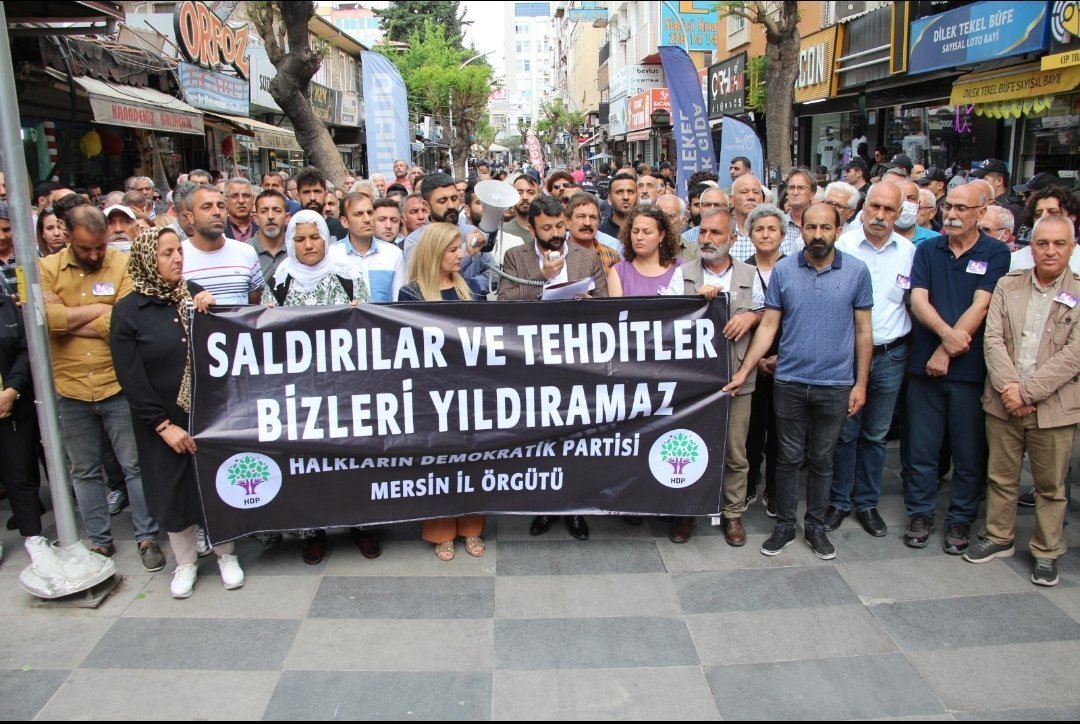 Halkların Demokratik Partisi (HDP) Mersin İl Örgütü, HDP Genel Merkezi önünde Diyarbakır’dan gelen ve evlat nöbetinde olduğunu söyleyen ailelerin siyah çelenk bırakması sırasında yaşanan gerginlik sonrası parti binasından çıkışları engelleyen polisin HDP’li Başaran’ı “Kes sesini, sen çivilerim” diyerek tehdit etmesini protesto etti. Parti binası önünde bir araya gelen parti üyelerine Emek ve Demokrasi Platformu bileşenleri destek verdi. “Saldırılar ve tehditler bizleri yıldıramaz” pankartının açıldığı açıklamada, “HDP halktır halk burada”, “HDP’ye uzanan eller kırılsın”, “Jin Jiyan Azadi” ve “Baskılar bizi yıldıramaz” sloganları attı.