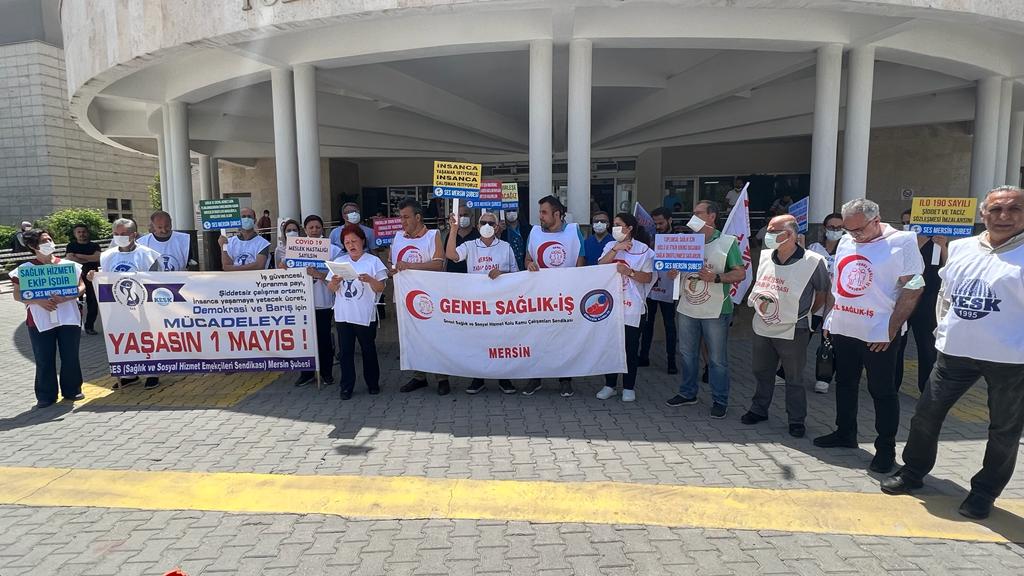 Mersin’deki sağlık emekçileri, 1 Mayıs’a çağrı yapmak için Sağlık Ve Sosyal Hizmet Emekçileri Sendikası (SES), Tabip Odası ve Genel Sağlık İş Mersin Şubeleri öncülüğünde Mersin Üniversitesi Tıp Fakültesi Hastanesi önünde bir araya geldi. Sağlık emekçileri adına açıklama yapan SES Örgütlenme Ve Eğitim Sekreteri Sevgi Başkavak, pandemi krizinin, ekonomik krizle birleştiğini ve etkilerini daha derinden hissettiklerini söyledi. Türkiye’de bugüne kadar 100 bin kişinin hayatını kaybettiği pandemi ile mücadelede 445 sağlık emekçisinin de hayatını kaybettiğini belirten Başkavak, “Pandemi ile mücadelede hayatını kaybeden tüm sağlık emekçisi arkadaşlarımızı saygı ile anıyoruz. Uzun zamana yayılan ekonomik krizin ağır yükünü her gün gelen zamlar nedeniyle daha da ağır yaşıyoruz. TL’nin değer kaybı alım gücümüzü düşürürken temel gıda maddelerine bile ulaşamaz duruma geldik. Maaşlarımıza yapılan zamlar daha ilk ayında eridi. Sağlık çalışanları olarak gece gündüz demeden halkımızın sağlığı için yoğun emek harcamakta ve fedakârca hizmet vermekteyiz. Pandemi dönemin de insan insandan kaçarken bizler artan iş yükü, ağır çalışma koşullarına rağmen sahada umut olduk, şifa olduk. Hakkınız ödenmez dediler, ödemediler. Sorunlarımızı görmezden geldiler taleplerimizi ertelediler verdikleri sözleri tutmadılar” ifadelerini kullandı.