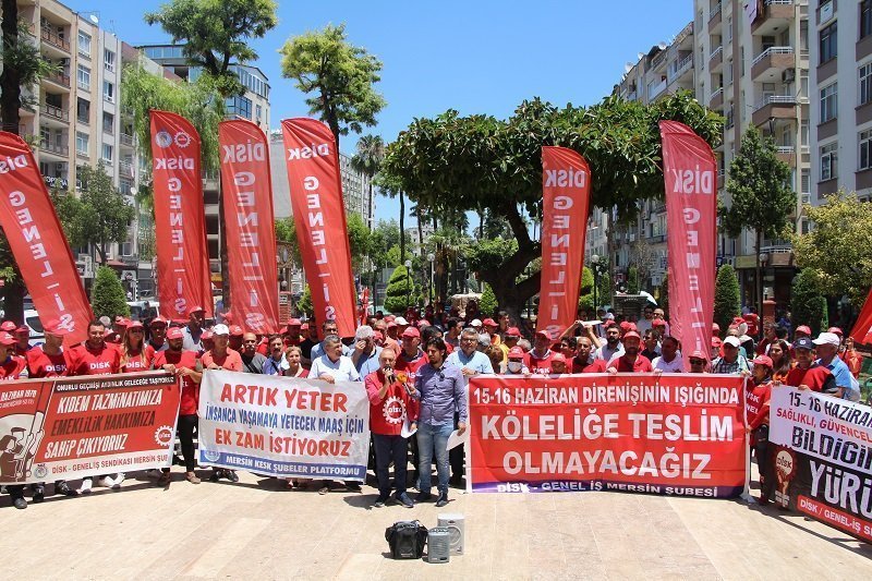 Büyük İşçi Direnişi’nin 52’nci yıl dönümünde DİSK öncülüğünde işçiler bir araya gelen işçiler, ülke genelinde alanlara indi. Mersin’de de DİSK Genel İş Mersin Şubesi çağrısıyla Özgür Çocuk Parkı’nda eylem yapan işçiler, mücadelelerine devam edeceklerini haykırdı. “15-16 Haziran direnişinin ışığında köleliğe teslim olmayacağız “, “Bildiğimiz yoldan yürüyoruz” ve “Onurlu geçmişi Aydıncık geleceğe taşıyoruz” pankartlarının açıldığı açıklamada “İnadına sendika inadına DİSK”, “İnsanca yaşamak istiyoruz” ve “Yandaşa değil emekçiye bütçe” sloganları atıldı. Burada açıklama yapan DİSK Genel İş Mersin Şube Başkanı Kemal Göksoy, işçinin ve emekçinin sefalet içinde yaşarken, patronların lüks içinde yaşadıklarını söyledi.