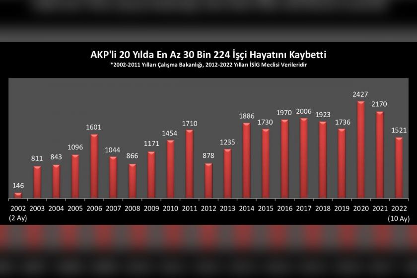 AKP iktidarı süresinde, 2002 yılının son iki ayında 146 işçi, 2003 yılında 811 işçi, 2004 yılında 843 işçi, 2005 yılında 1096 işçi, 2006 yılında 1601 işçi, 2007 yılında 1044 işçi, 2008 yılında 866 işçi, 2009 yılında 1171 işçi, 2010 yılında 1454 işçi, 2011 yılında 1710 işçi, 2012 yılında 878 işçi, 2013 yılında 1235 işçi, 2014 yılında 1886 işçi, 2015 yılında 1730 işçi, 2016 yılında 1970 işçi, 2017 yılında 2006 işçi, 2018 yılında 1923 işçi, 2019 yılında 1736 işçi, 2020 yılında 2427 işçi, 2021 yılında 2170 işçi ve 2022 yılının ilk on ayında 1521 işçi iş cinayetlerinde hayatını kaybetti.