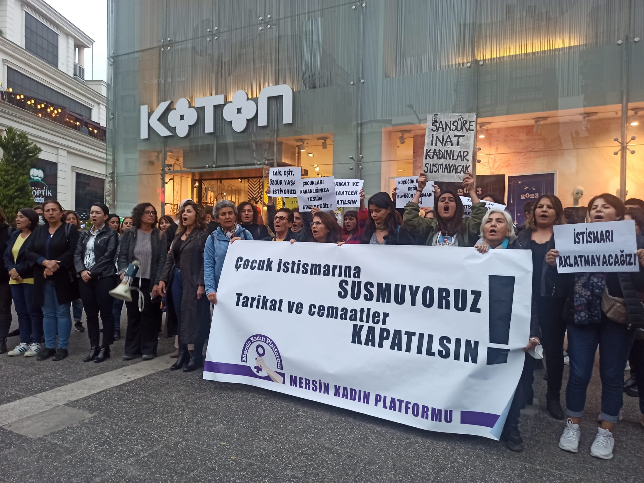 Mersin Kadın Platformu, Koton önünde yaptıkların basın açıklamasıyla İsmailağa Cemaatine bağlı Hiranur Vakfı kurucusu Yusuf Ziya Gümüşel’in 6 yaşındaki kızını müridi ile evlendirmesine tepki gösterdi. “AKP elini çocuklardan çek” sloganlarının atıldığı açıklamaya çok sayıda kadın katıldı. Platform adına basın metnini okuyan Elmas Kara, “Tarikat ve cemaatler kapatılsın. İstismarın aklanmasına, üstünün örtülmesine izin vermeyeceğiz!” dedi.