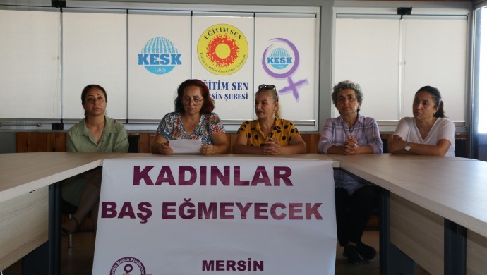 Mersin Kadın Platformu, artan hak ihlalleri, işkence ve adaletsizliğe karşı Eğitim ve Bilim Emekçileri Sendikası (Eğitim Sen) Şube binasında açıklama yaptı. “Kadınlar baş eğmeyecek” pankartının açıldığı açıklamada Mersin Kadın Platformu üyesi Zeynep Kaya konuştu.