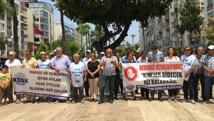 KESK Mersin Şubeler Platformu üyeleri, Özgür Çocuk Park’ta açıklama yaptı. “Haksız hukuksuz işten atılan KESK üyeleri işlerine iade edilsin” pankartının açıldığı açıklamada, “Reddinizi reddediyoruz, KHK’ler gidecek biz kalacağız” sloganı atıldı. Açıklamayı yapan Sağlık ve Sosyal Hizmet Emekçileri Sendikası (SES) Mersin Şubesi Başkanı Zeki Sinan Doğan, haksız ve hukuksuz ihraçların cinayet olduğunu belirtti. Hukuka ve uluslararası sözleşmelere aykırı, hükümetin bir organı gibi çalışan OHAL Komisyonu’nun lağvedilmesini isteyen Doğan, ret kararlarının iptal edilmesi çağrısında bulunarak, “Haklarında memuriyeti engellenen herhangi bir kesinleşmiş yargı kararı bulunmayan, hukuken suç olmayan gerekçelerle ihraç edilen kamu görevlileri işlerine iade edilmeli. ‘Arşiv kaydı’ ve ‘Güvenlik soruşturması’ bahanesiyle işinden edilen kamu ve yerel yönetimlerdeki emekçiler derhal işlerine iade edilsin. Geçici 35’inci madde yürürlükten kaldırılsın. Temel hak ve özgürlüklere yönelik baskı politikalarına derhal son verilmeli, ceza ve soruşturmalar durmalı. Hukuksuzca işlerinden eden hükümete asla vazgeçmeyeceğimizi haykırıyoruz” dedi.
