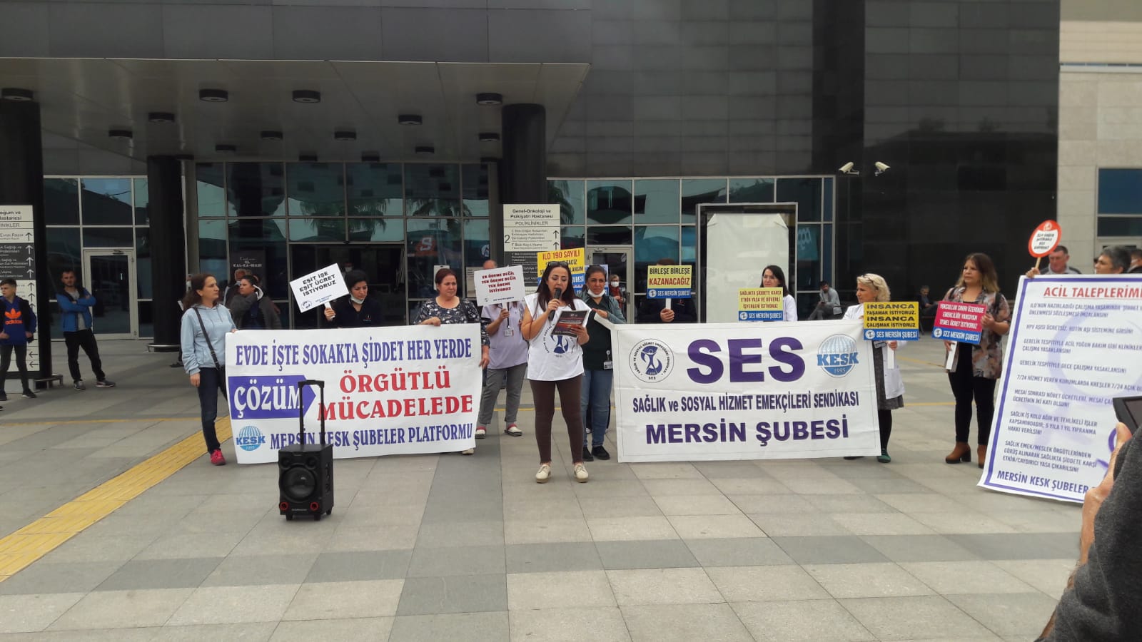 KESK Mersin Şubeler Platformu üyesi kadınlar, 25 Kasım Kadına Karşı Şiddetle Mücadele Günü kapsamında alana indi. Şehir Hastanesi önünde bir araya gelen KESK’li kadınlar, şiddet, taciz, mobinge karşı ses çıkardı. Açıklamada Sağlık ve Sosyal Hizmet Emekçileri Sendikası (SES) Mersin Şube Kadın Sekreteri Filiz Çelebi konuştu.