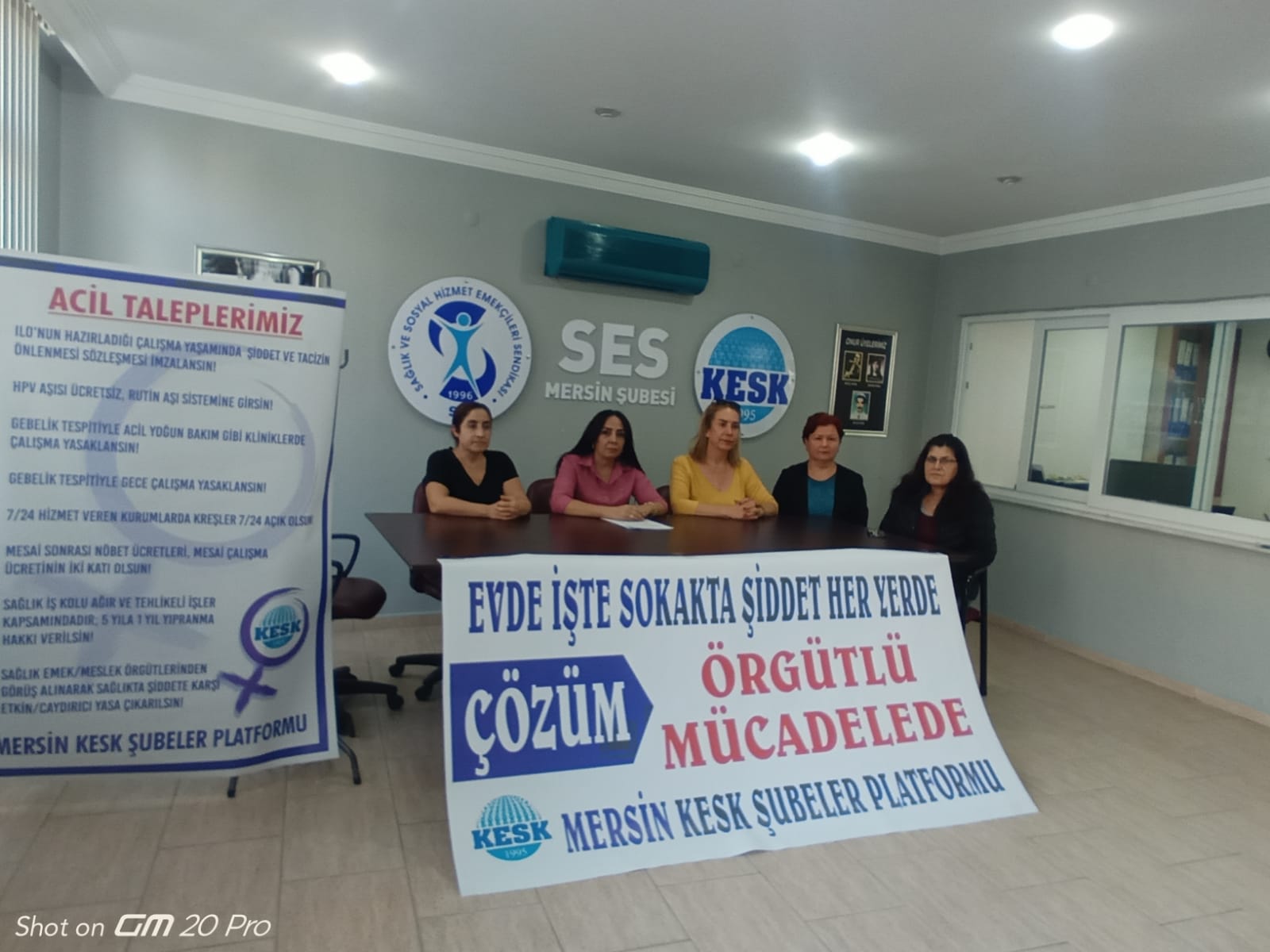 KESK Mersin Şubeler Platformu yaptığı basın toplantısıyla 25 Kasım programını açıkladı. SES Mersin Şubesi’nde yapılan açıklamada, “Evde, işte, sokakta, şiddet her yerde çözüm örgütlü mücadele” pankartı asıldı. Kadınlar adına açıklamayı SES Mersin Şube Kadın Sekreteri Filiz Çelebi okudu.