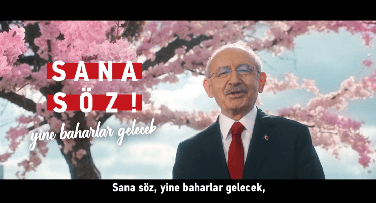 Millet İttifakı’nın Cumhurbaşkanı Adayı ve CHP Genel Başkanı Kemal Kılıçdaroğlu, sosyal medya hesabından “Sana Söz yine baharlar gelecek…” notuyla bir video paylaştı. Videoda Levent Yüksel’in Tuana isimli parçasından uyarlanan bir şarkı kullanılırken, şarkıda “Sana söz yine baharlar gelecek, sana söz umut bitmeyecek” ifadeleri yer aldı.