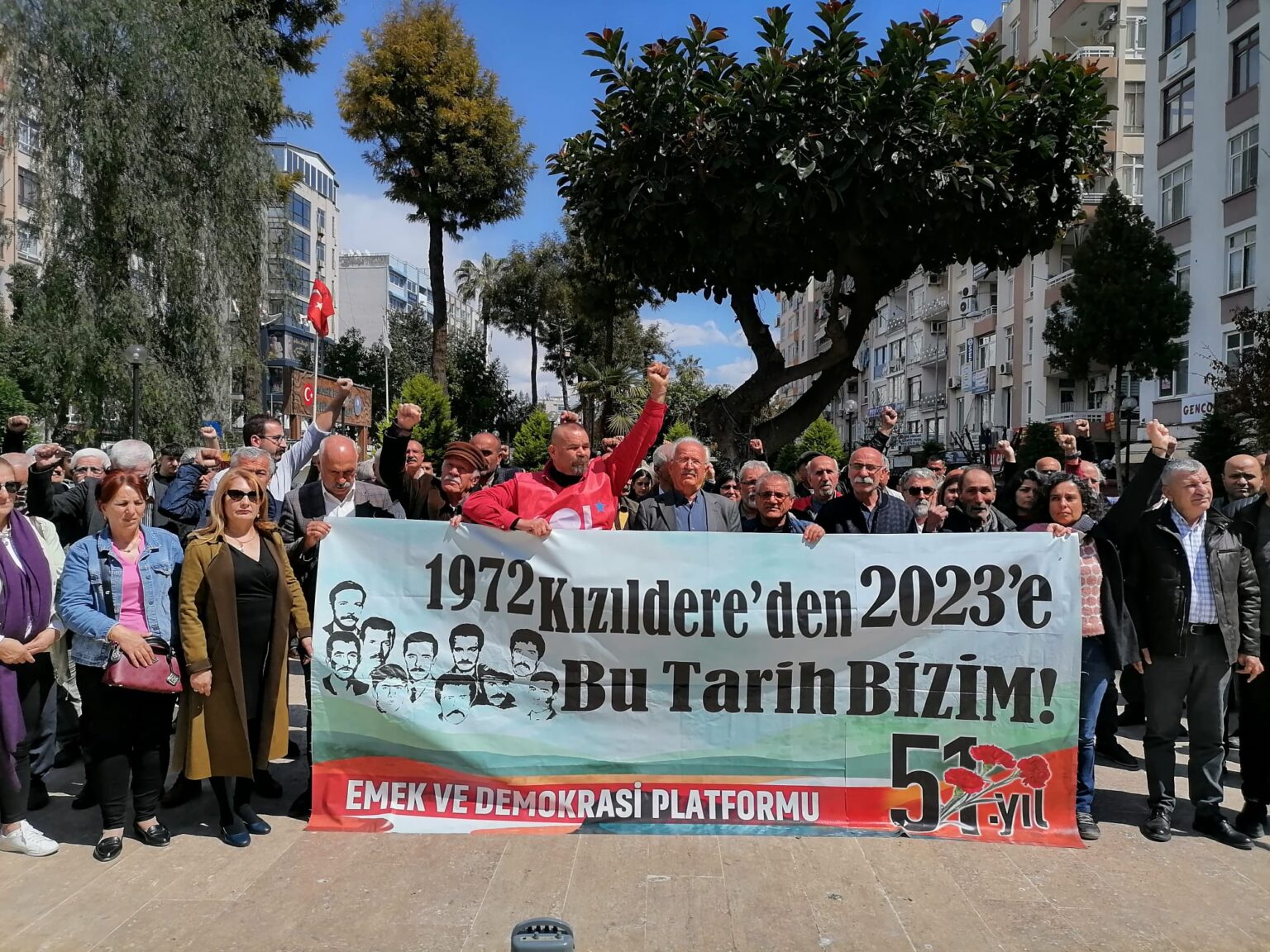 Mersin Emek ve Demokrasi Platformu’nun çağrısıyla Özgür Çocuk Parkı’nda bir araya gelenler “Onlara Sözümüz Devrim Olacak”, “Kızıldere Son Değil Mücadele Sürüyor” sloganlarını attı. Eylem bir dakikalık saygı duruşuyla başladı. Sonrasında basın açıklaması yapıldı. Basın metnini okuyan Mersin 68’liler Derneği Yönetim Kurulu Başkanı Hasan Kapıkıran şunları söyledi: 30 Mart 1972’de, on devrimci yoldaşımız, Mahir Çayan, Sinan Kazım Özüdoğru, Hüdai Arıkan, Saffet Alp, Sabahattin Kurt, Ertan Saruhan, Cihan Alptekin, Ömer Ayna, Nihat Yılmaz ve Ahmet Atasoy, Niksar’ın Kızıldere köyünde kuşatıldıkları kerpiç bir evde katledilmelerinin üzerinden 51 yıl geçti. Deniz Gezmiş, Hüseyin İnan, Yusuf Aslan ve arkadaşlarını idamdan kurtarmak için yaptıkları bu girişim dayanışmanın en iyi örneklerinden biri olarak tarihteki yerini aldı.