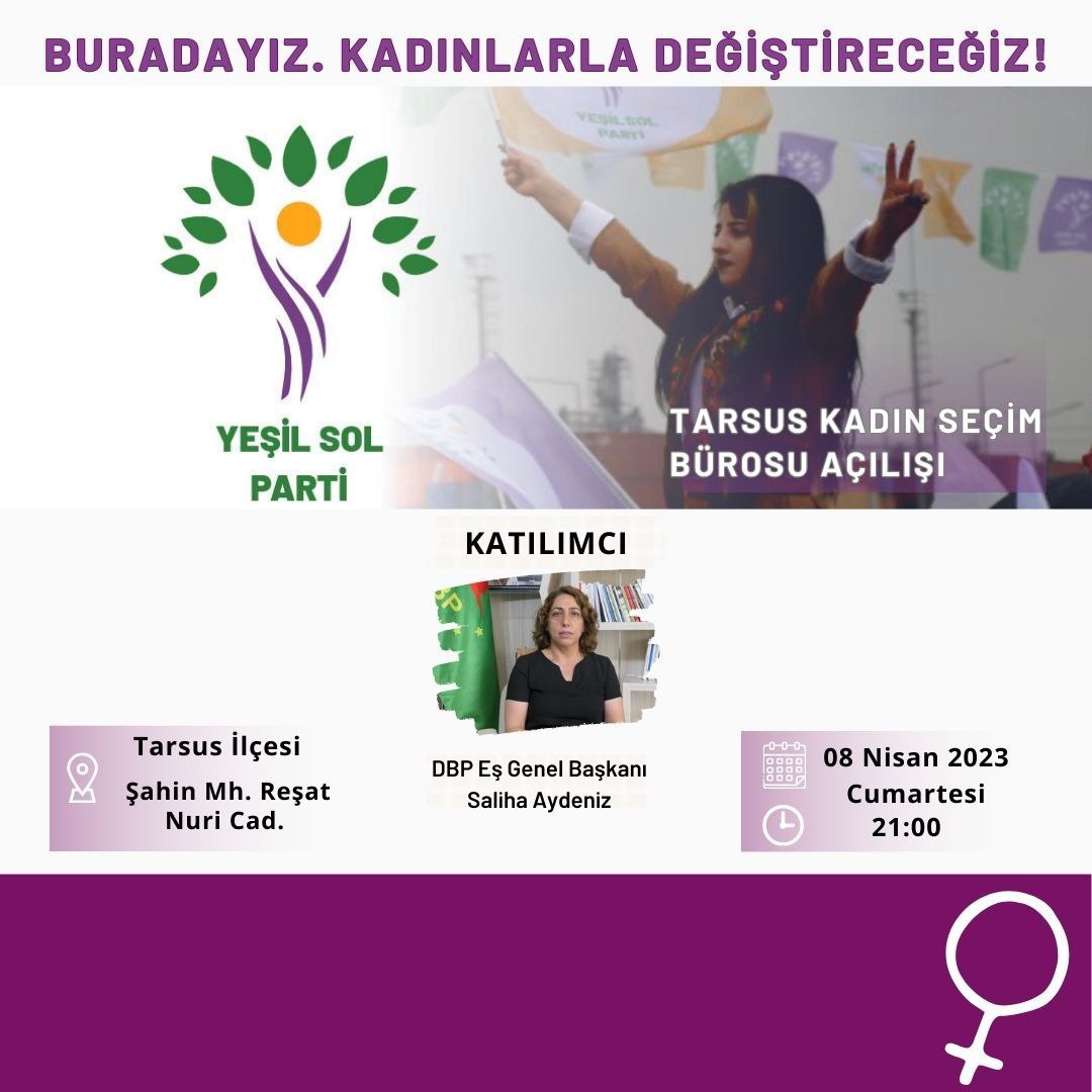 Yeşil Sol Parti, 14 Mayıs 2023 seçimlerine ilişkin bir çok kentte seçim büro açılışlarını gerçekleştiriyor. Mersin’de de bugün Şevket Sümer Mahallesinde seçim bürosu açılışı gerçekleştirildi. Gerçekleşen açılış mitinge dönüştü. Yeşil Sol Parti, Mersin’de kadın seçim bürosunu açıyor. Tarsus ilçesine bağlı Şahin Mahallesi’nde 8 Nisan günü (yarın) saat 21.00’de açılacak kadın seçim bürosunun açılışına DBP Eş Genel Başkanı Saliha Aydeniz katılacak.