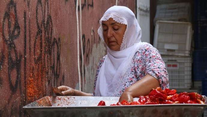 Çukurova’da kış mevsiminde sofraların vazgeçilmezi olan kurutmalık ve biber salçası, kadınların uzun uğraşları sonucu sofralardaki yerini almaya hazır hale getiriliyor. Halden satın aldıkları veya tarlada topladıkları biberleri kışa hazırlayan kadınlar, bir kısmını kurutmalık ve pul biber bir kısmıyla da salça yapıyor. Mersin’in Akdeniz ilçesinde, hem sofralara lezzet katmak hem de bütçe için her yıl yapılan salçanın zorlu üretim süreci başladı.