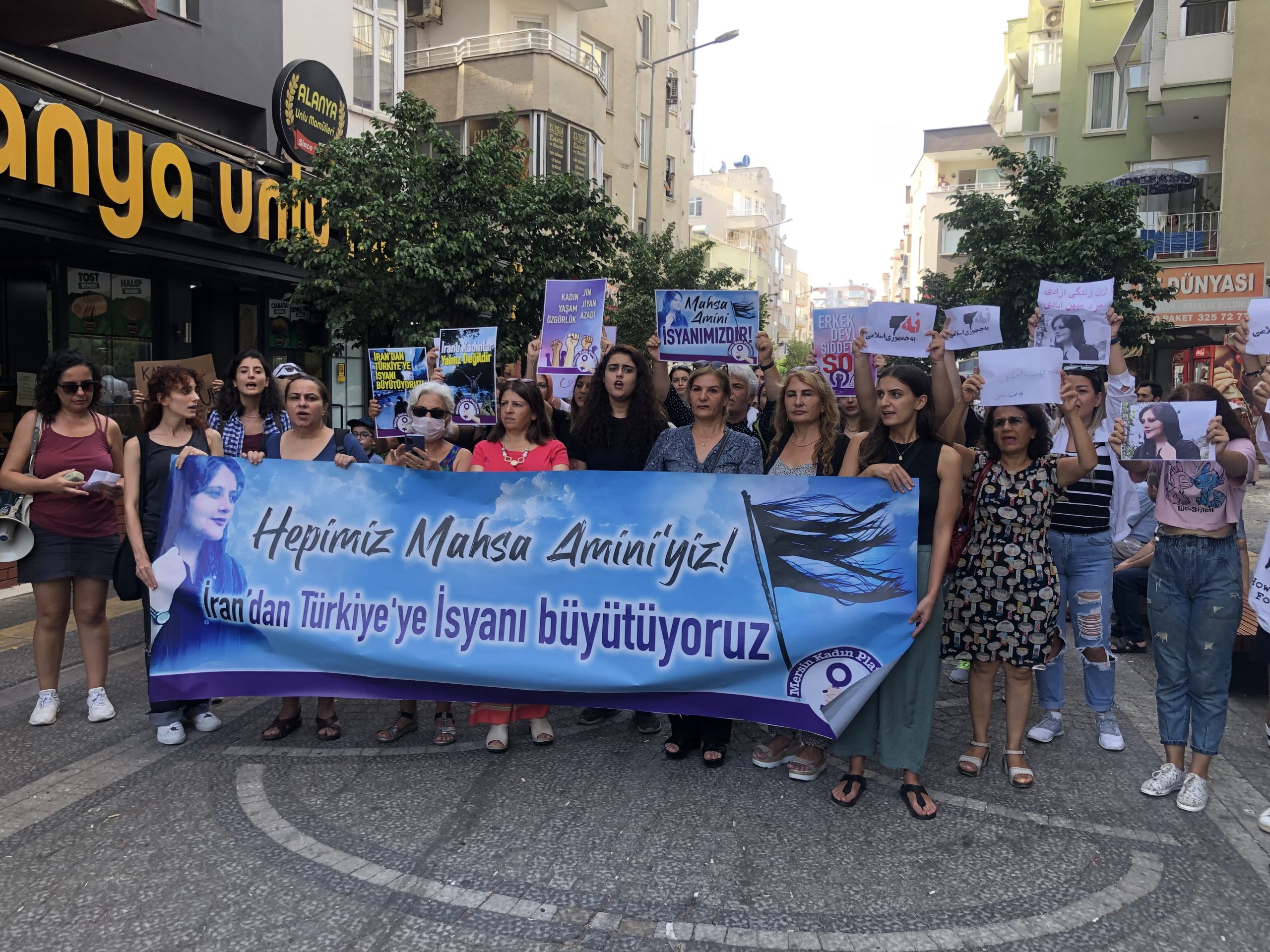 İran’da “ahlak polisi” tarafından işkenceyle katledilen Jîna Mahsa Amini için sokağa çıkan kadınlar, açıklama yaptı. Mersin Kadın Platformu, Alanya Sokağı girişinde açıklama yaptı. Kürtçe, Türkçe ve Arapça “Jin jiyan azadi” ile “Katledilen kadınlar isyanımızdır” sloganları atan kadınlar, Jîna Mahsa Amini’nin fotoğrafının yanı sıra “Hepimiz Mahsa Amini’yiz” pankartı taşıdı. Halkların Demokratik Partisi (HDP) Mersin Milletvekili Fatma Kurtalan’ın da katıldığı açıklamada konuşan Ceren İnan, İran’da direnişin başladığı günden bu yana 200’den fazla kişi yaşamını yitirdiğini, en az 5 bin kişinin ise tutuklandığını aktardı.