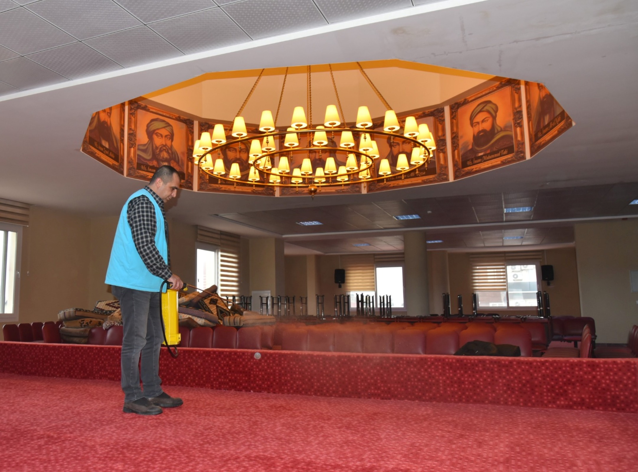 Temizlik İşleri Müdürlüğü ekiplerince; ibadethanelerdeki halılar, halı yıkama makinesiyle yerinde yıkanarak hijyenik hale getirilirken, avlu, tuvalet, kapı kolları ve ayakkabılık gibi temasın olabileceği tüm yüzeyler dezenfekte ediliyor.
