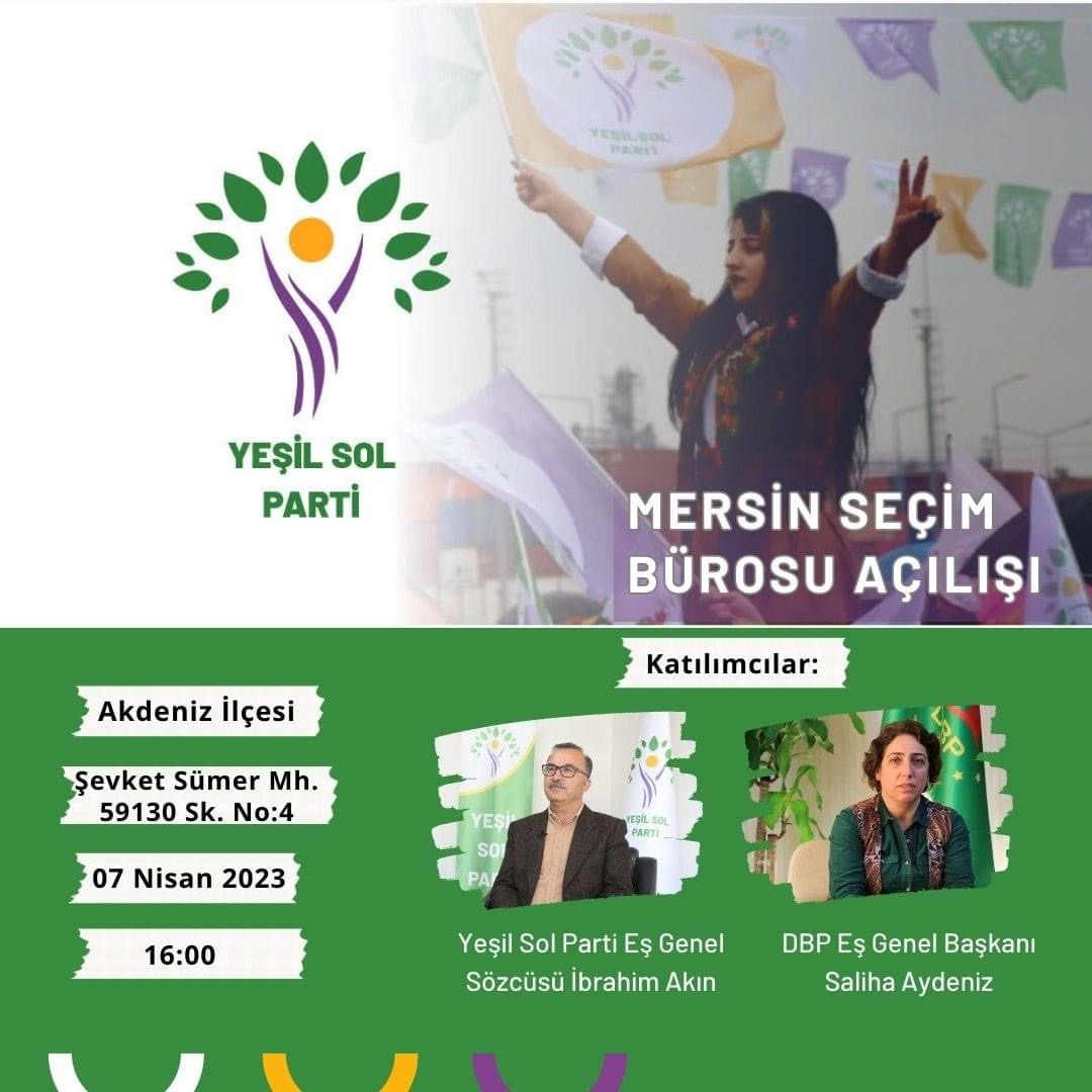 Yeşil Sol Parti, Mersin’de ilk seçim bürosunu 7 Nisan günü saat 16.00’da açacak. Akdeniz İlçesine bağlı Şevket Sümer Mahallesi’nde açılacak seçim büro etkinliğine, Yeşil Sol Parti Eş Genel Sözcüsü İbrahim Akın ve Demokratik Bölgeler Partisi (DBP) Eş Genel Başkanı Saliha Aydeniz’in katılacak.